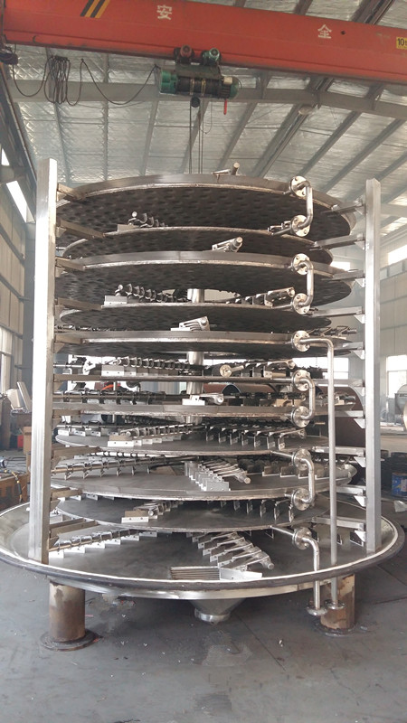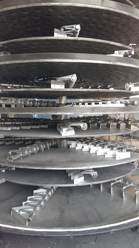 濕物料由加料器加入干燥器上部的干燥盤上,耙臂作回轉(zhuǎn)運動,使耙葉做到連續(xù)地翻炒物料。物料沿指數(shù)螺旋線流過干燥盤表面,在小干燥盤上的物料被移到外緣,并在外緣落到下方的大干燥盤外緣,在大干盤上物料向里移動,通過中間落料口落入下一層的小干燥盤中。大小干燥盤上下交替排列,從而物料可以連續(xù)地流過干燥器。